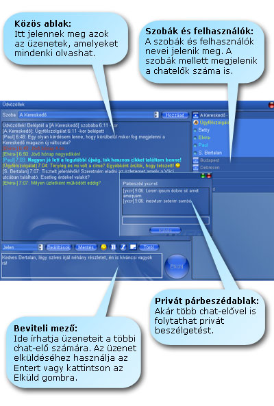 3. �rni a Chat ablak als� r�sz�n l�v� beviteli mez�ben lehets�ges, amelyet az Elk�ld gombbal, vagy a klaviat�ra Enter megnyom�s�val jelen�thet meg. Az �zenete az aktu�lis szob�ban mindenki sz�m�ra olvashat� lesz.