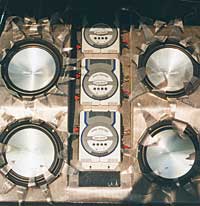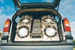Az elv�r�sokat a demoaut�k �p�t�s�ben nagy tapasztalattal rendelkez� MegaWatt St�di� el�g�tette ki. Siker�ket a ki�ll�t�son az aut�ik k�z�tt tolong� t�meg bizony�totta. Az Opel gy�ri akkumul�tor�t egy Exide Maxima 900-as akksi v�ltotta fel. Innen egy 80A AGU biztos�t�kon kereszt�l 20 mm2-es t�pk�belek vezetnek a csomagtart�ban elhelyezett t�peloszt�khoz. Ide csatlakoznak az er�s�t�k egyenk�nt 10 mm2-es t�pk�belei is, �s ez az a pont, ahol oldhat� a t�pk�bel-csatlakoztat�s is. A fejegys�g egy Nakamichi CD 45Z, melynek 4 V-os subvoofer-kimenet�t Dietz RCA k�bel k�ti �ssze a l�da h�tulj�n kialak�tott RCA csatlakoz�val.