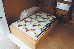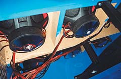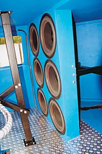 A "l�da", amiben megsz�lalnak ezek a fenevadak, els� pillant�sra meglehet�sen egyszer�nek t�nik. Egy falapon sorakozik a 6 hangsz�r�, mellett�k j�kora ny�l�s. Free-air rendszer�nek t�nik az eg�sz. De nem az. Irgalmatlan m�ret� exponenci�lis t�lcs�rk�nt kell az eg�sz bels� teret elk�pzelni. A pontos m�retez�s term�szetesen hadititok. A l�da mag�ban j� 600 kil�sra sikeredett, h�la az el�rhet� legvastagabb faanyagnak. A t�pell�t�s ezekben a speci�lis, hangnyom�sversenyz�sre �p�tett aut�kban mindig k�l�n gond. A Bedfordba is egyedi akkumul�torok ker�ltek, p�r sz�z kil�val n�velve az �ns�lyt. Egy komplett verseny alatt ebben a monstrumban alig-alig cs�kken a fesz�lts�gszint. A rakt�r jobb oldal�ban �rv�lkod� Optima csak a fejegys�get l�tja el �rammal. A k�belek 50 n�gyzetmillim�ter felettiek, �s a hangsz�r�khoz fut� vezet�kek m�s aut�kban m�retes t�pk�belk�nt funkcion�lnak.