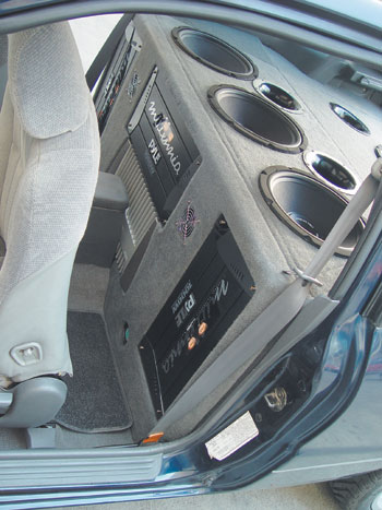 Az install�ci� mag�t�l �rtet�d�en a karossz�ria rezg�smentes�t�s�vel kezd�d�tt. Ehhez a folyamathoz bitumenlapokat, vatelint, illetve Noise Exet haszn�ltak. A biztos �ramell�t�s �rdek�ben Exide Deep Cycle akksi ker�lt a motort�rbe. Fejegys�gnek - nem meglep� - egy Kenwood modellt v�lasztottak, m�gpedig a c�g KDC M-902-es t�pus�, MP3-as f�jlok lej�tsz�s�ra is alkalmas k�sz�l�k�t. Az els� ajt�kon kapott helyet a Coral Electronic HE210-es m�lyk�zepe - ebb�l is mindj�rt kett� -, mely az egyedi panelen szerelve, a hagyom�nyost�l elt�r�en kis kr�mozott v�d�keretet kapott. A magasakat - mert term�szetesen ezekb�l is 2 p�r van oldalank�nt - a m�r megszokott helyre install�lt�k.